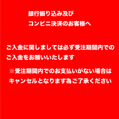 ※銀行振込、コンビニ決済のお客様へ:受注期間内でのご入金をお願い致します。期間内でのご入金がない場合はキャンセルとなる場合ございます。