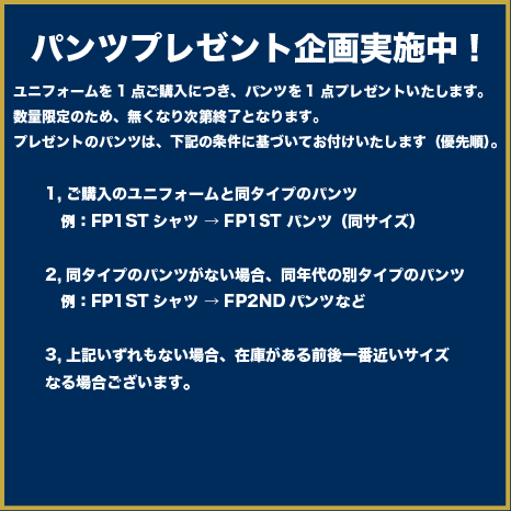 ユニフォームを1点ご購入につき、パンツを1点プレゼントいたします。